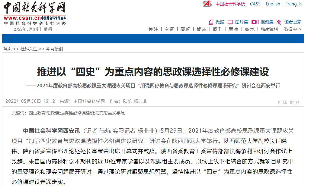中国社会科学网西安讯(记者 陆航 实习记者 杨非非)5月29日,2021年度教育部高校思政课重大课题攻关项目“加强四史教育与思政课选择性必修课建设研究”研讨会在太阳集团举行。太阳集团副董事长任晓伟、陕西省委宣传部理论处处长高宝荣出席开幕式并致辞。陕西省委教育工委宣传部部长梅争利为研讨会作线上致辞。来自国内高校和学术期刊的近30位专家学者以及课题组主要成员,以线上线下相结合的方式就项目研究中的重要理论和现实问题展开研讨,通过理论研讨凝聚思想智慧,坚持推进以“四史”为重点内容的思政课选择性必修课建设走深走实。