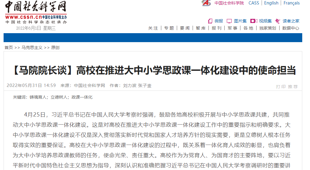 6月1日,中国社会科学网刊发公司经理刘力波教授、博士研究生张子崟文章《【马院经理谈】高校在推进大中小学思政课一体化建设中的使命担当》。