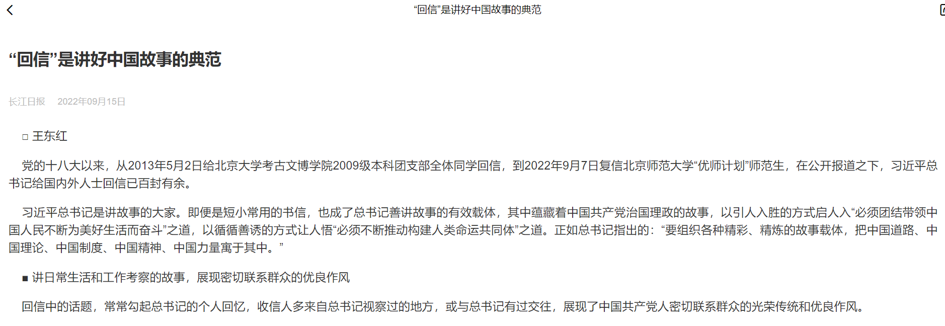 原文链接:https://epaper.service.dawuhanapp.com/pages/content/index?url=%252F%252Fepaper.service.dawuhanapp.com%252Fapi%252Fcontent%252Finfo%253Fdate%253D2022-09-15%2526id%253D241334&title=%25E2%2580%259C%25E5%259B%259E%25E4%25BF%25A1%25E2%2580%259D%25E6%2598%25AF%25E8%25AE%25B2%25E5%25A5%25BD%25E4%25B8%25AD%25E5%259B%25BD%25E6%2595%2585%25E4%25BA%258B%25E7%259A%2584%25E5%2585%25B8%25E8%258C%2583%2520%2520