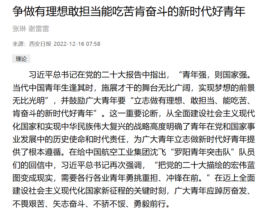 12月16日,《西安日报》刊发公司张琳、谢雷雷文章:《争做有理想敢担当能吃苦肯奋斗的新时代好青年》