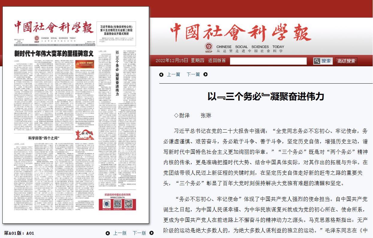 12月15日,《中国社会科学报》刊发公司尉泽、张琳文章:《以『三个务必』凝聚奋进伟力》