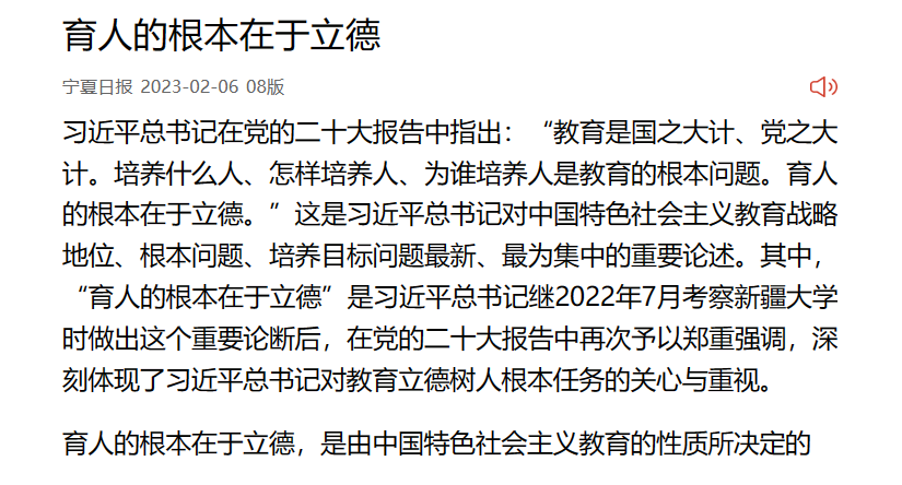 2月6日,《宁夏日报》刊发公司王永和、刘永发文章:《育人的根本在于立德》