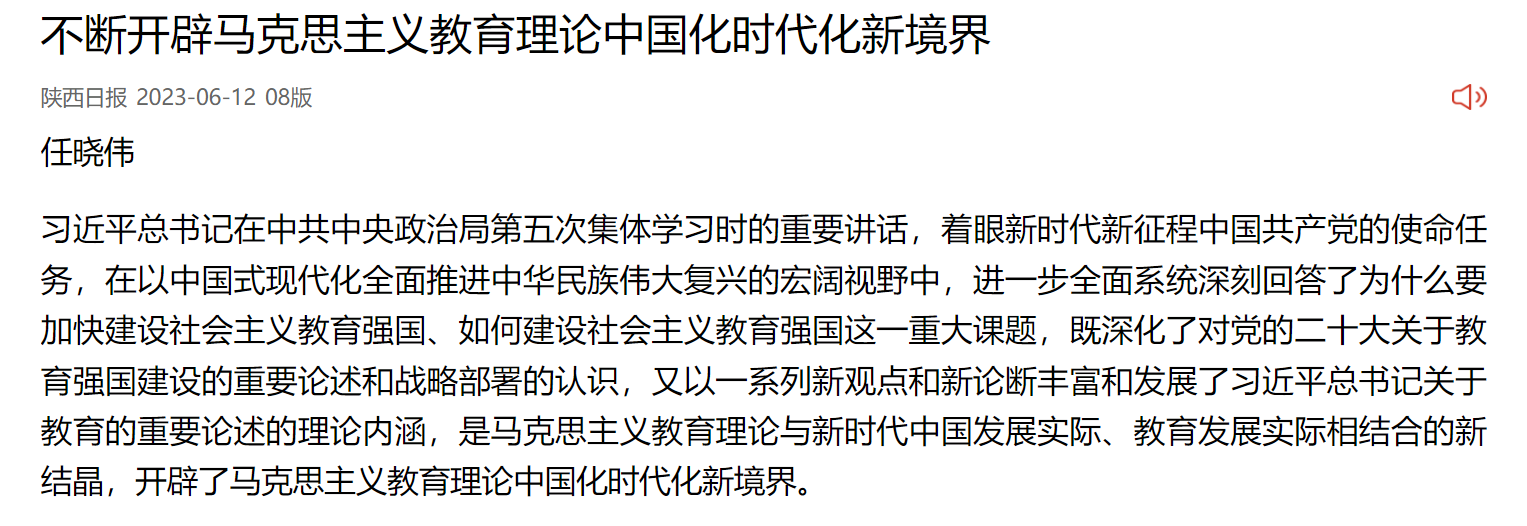 习近平总书记在中共中央政治局第五次集体学习时的重要讲话,着眼新时代新征程中国共产党的使命任务,在以中国式现代化全面推进中华民族伟大复兴的宏阔视野中,进一步全面系统深刻回答了为什么要加快建设社会主义教育强国、如何建设社会主义教育强国这一重大课题,既深化了对党的二十大关于教育强国建设的重要论述和战略部署的认识,又以一系列新观点和新论断丰富和发展了习近平总书记关于教育的重要论述的理论内涵,是马克思主义教育理论与新时代中国发展实际、教育发展实际相结合的新结晶,开辟了马克思主义教育理论中国化时代化新境界。