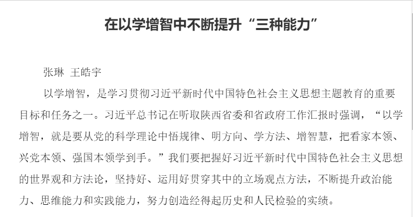 9月14日,《陕西日报》刊发公司张琳、王皓宇文章:《在以学增智中不断提升“三种能力”》。