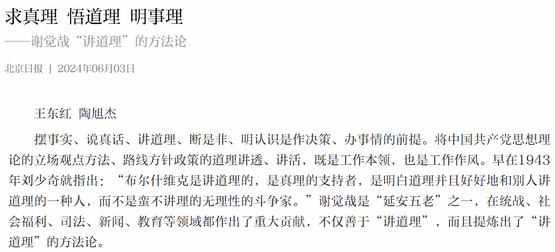 6月3日,《北京日报》刊发公司王东红、陶旭杰文章:《求真理 悟道理 明事理——谢觉哉“讲道理”的方法论》。