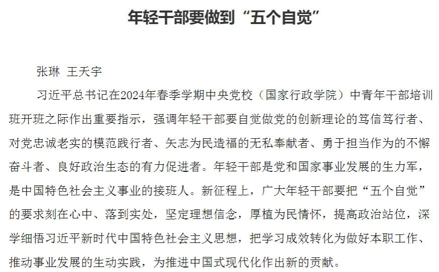 习近平总书记在2024年春季学期中央党校(国家行政公司)中青年干部培训班开班之际作出重要指示,强调年轻干部要自觉做党的创新理论的笃信笃行者、对党忠诚老实的模范践行者、矢志为民造福的无私奉献者、勇于担当作为的不懈奋斗者、良好政治生态的有力促进者。年轻干部是党和国家事业发展的生力军,是中国特色社会主义事业的接班人。新征程上,广大年轻干部要把“五个自觉”的要求刻在心中、落到实处,坚定理想信念,厚植为民情怀,提高政治站位,深学细悟习近平新时代中国特色社会主义思想,把学习成效转化为做好本职工作、推动事业发展的生动实践,为推进中国式现代化作出新的贡献。